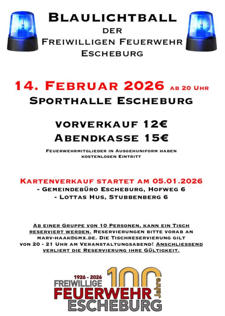 Die FFE lädt ganz Escheburg und Umgebung zur Feier des 100-jährigen Jubiläums der Freiwilligen Feuerwehr Escheburg ein.